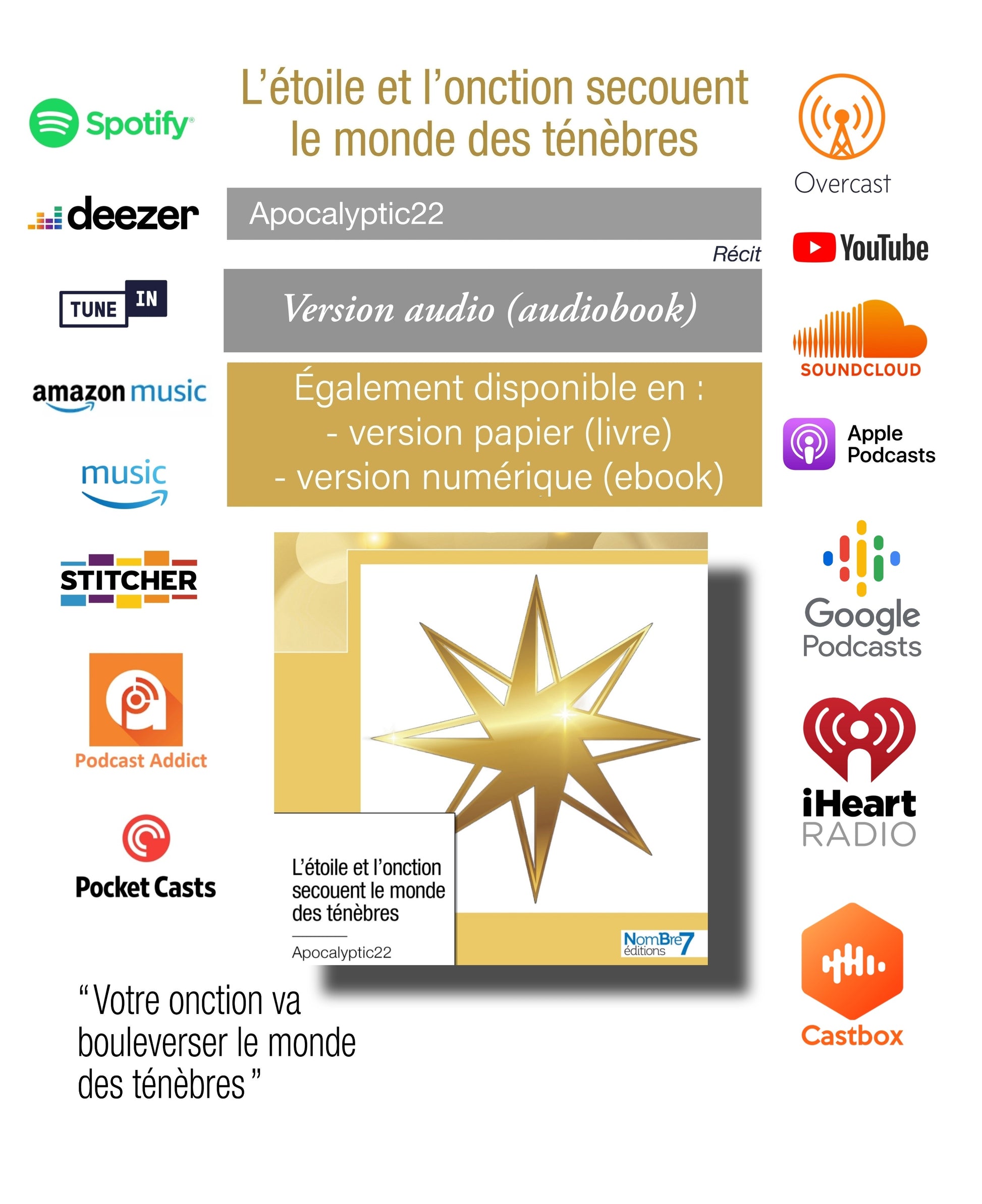 AUDIOBOOK(有聲書): 收聽可在 Spotify、Deezer、Souncloud、YouTube、Apple 播客、亞馬遜音樂、Google 播客、Audible、Tune in、Stitcher、iHeart Radio、Podcast Addict、Pocket Casts、Castbox、Overcast、Ivoox、Audacy,以及許多其他平台...