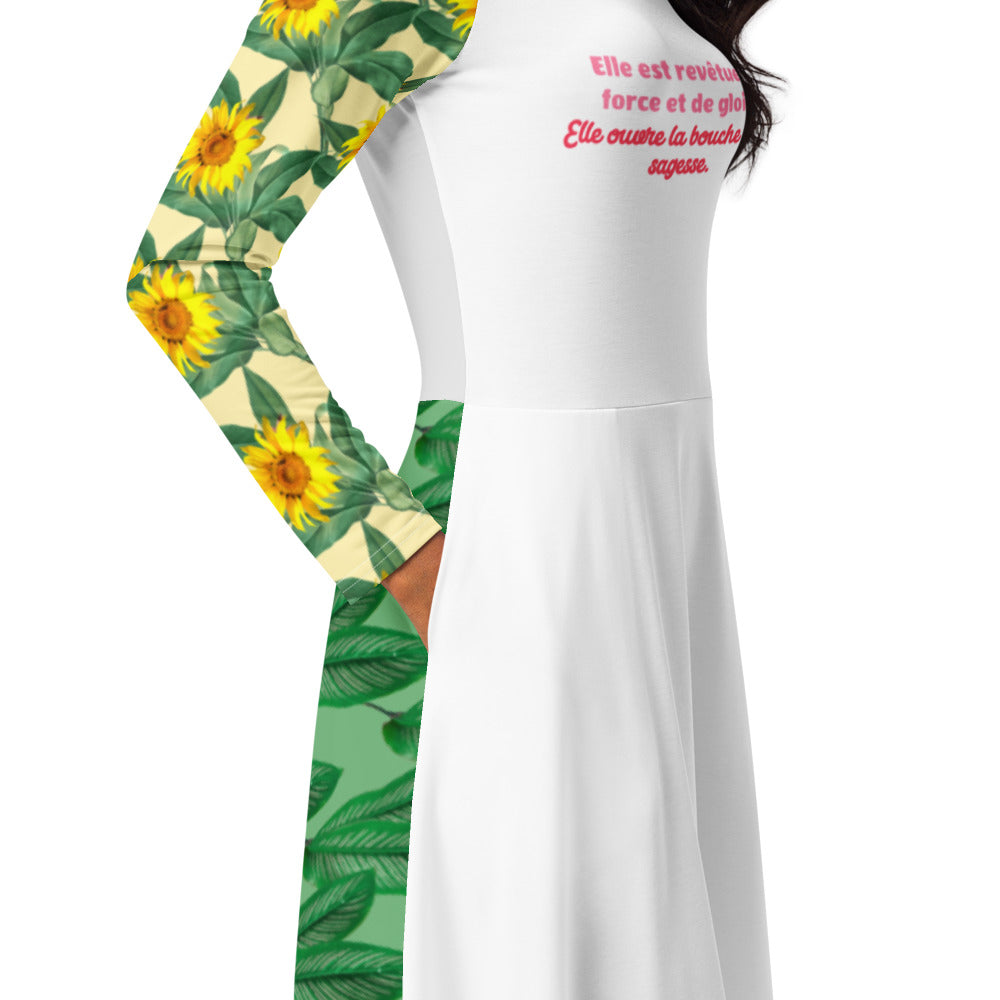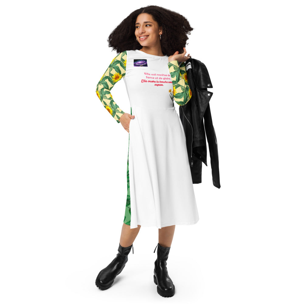 這是你最愛的新裙子! 「她以能力和榮耀為衣,以智慧開口。」柔軟的面料和和諧的剪裁,保證你一整天都倍感舒適。腰部修身,下擺呈喇叭形。這條裙子最棒的地方是什麼?它有口袋。